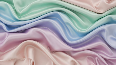 Soft, flowing waves of pastel silk fabric in shades of pink, lavender, blue, and green create a luxurious and gentle texture.