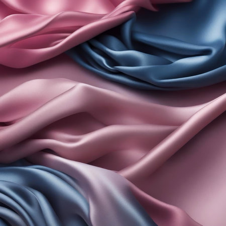 Elegant satin fabric folds in soft pink and serene blue, creating a luxurious texture perfect for backgrounds or design projects. Image with a gentle and soothing color palette, crafted by Generated AI.