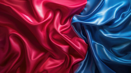 Vibrant red and blue satin fabric with luxurious, wavy texture
