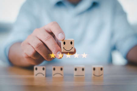 best excellent business services rating customer experience. Satisfaction survey concept. Hand of a businessman chooses a smiley face on wood block cube. 5 Star Satisfaction.