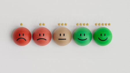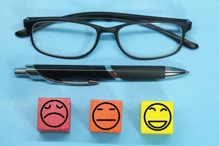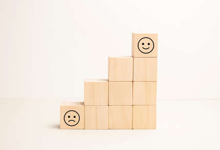 Colorful wooden blocks with emotion face. Customer evaluation and satisfaction concept.