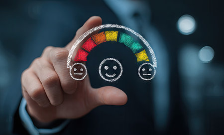 Visual representation of a rating system with emoji faces showing customer feedback, highlighted on a row of hands demonstrating formal attire and engagement.