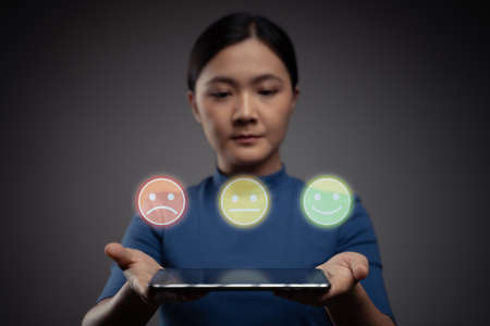 Customer choose Emoticon for user reviews. Service rating, ranking, customer review, satisfaction, evaluation and feedback concept