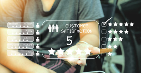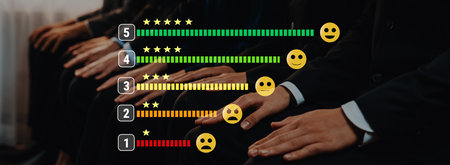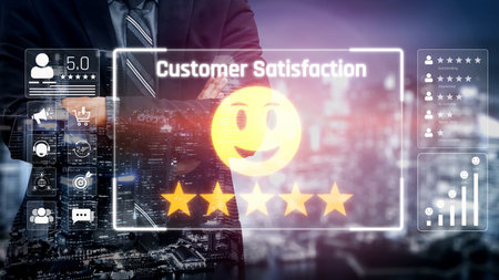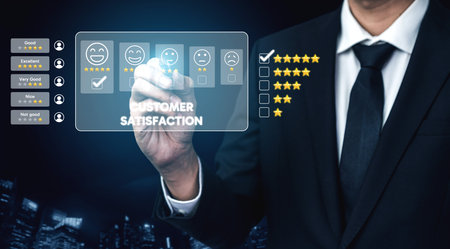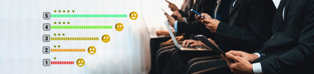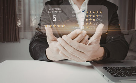 Customer review satisfaction feedback survey concept. User give rating to service experience on online application. Customer can evaluate quality of service leading to reputation ranking of business.