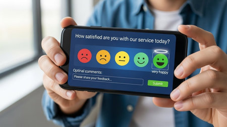 A hand holds a customer satisfaction survey with a happy face in the center, alongside other less pleased faces. The scale features various colors across the semi-circle design. It suggests a focus on the customer experience and gauging sentiment, suitable for business and editorial use in articles on feedback or metrics.