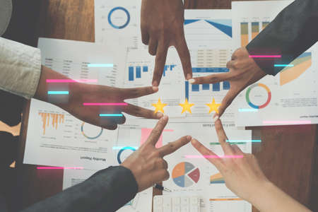 Businessman giving rating with 5 star, Customer service and Satisfaction ,Business people man giving Feedback via the Internet. Positive Review. Client Satisfaction Surveys