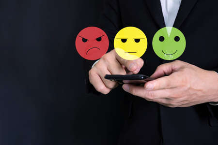 Men use their smartphones to rate customer service and satisfaction. Emoticons, happy smiley faces to provide satisfaction in service and rate of service rating. Buying products online Doing business.