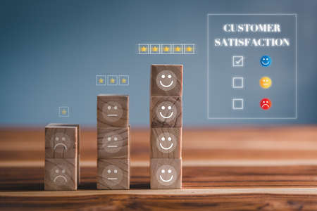 Customer feedback, service rating, satisfaction, customer experience concept. Evaluation for improvement product and service. Hand puts wooden cubes with emotions satisfaction meter icons.