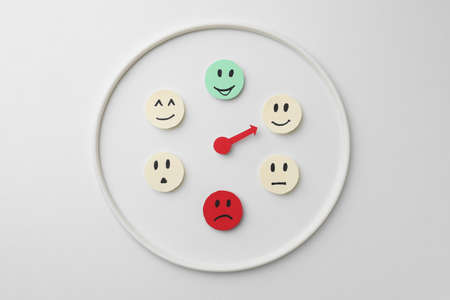Mood indicator on white background, flat lay. Emotional management