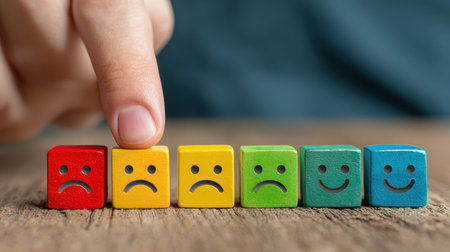 Colorful wooden blocks representing various emotions with a hand selecting a block, illustrating feelings and expressions of happiness and sadness