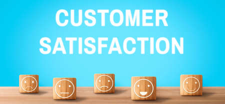 This square wooden block with emoticons is used to allow customers to assess their satisfaction after using the service. Panorama banner background with copy space.