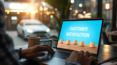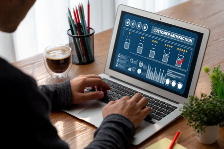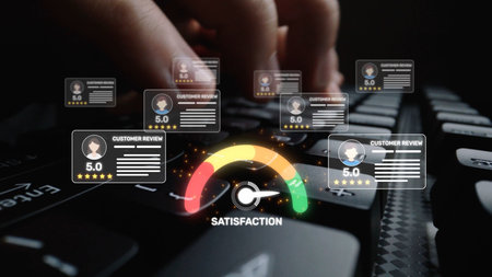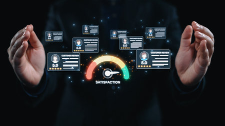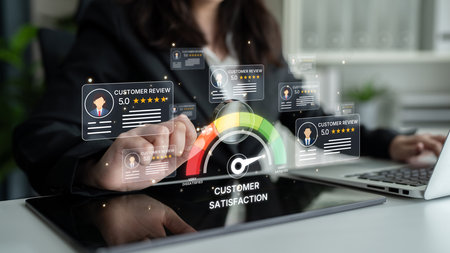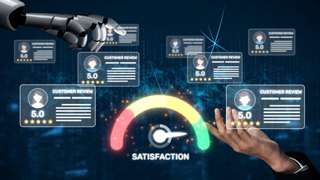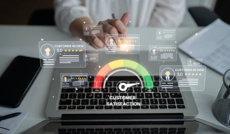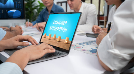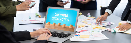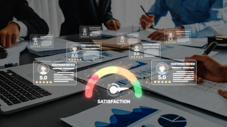 Visual representation of customer satisfaction through ratings and reviews, featuring a modern dashboard and professional team discussing strategies for improvement. Raster