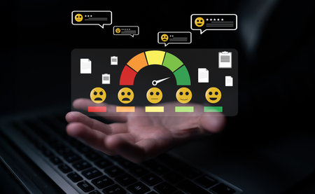 Customer feedback and satisfaction rating system showing star review, happy face, performance score, and service evaluation to improve customer experience.