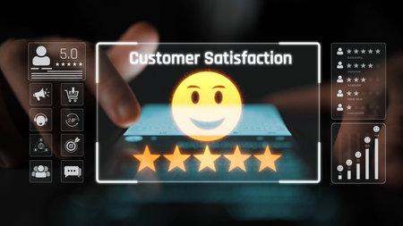 A person's hands are shown holding a holographic display that indicates a five-star customer satisfaction rating. The individual appears to be presenting the rating, which is highlighted with golden stars and a glowing background. A laptop is visible in the background, suggesting a professional setting.