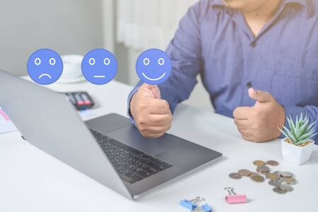 Customer review and feedback with smile face icon to give satisfaction in service. Online review concept of assessment testimonial customer service and feedback, Opinion rating very good.