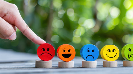 A hand gently touches a row of vibrant wooden tokens depicting various emotions in a natural setting, highlighting the importance of mood expression and emotional awareness.