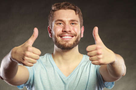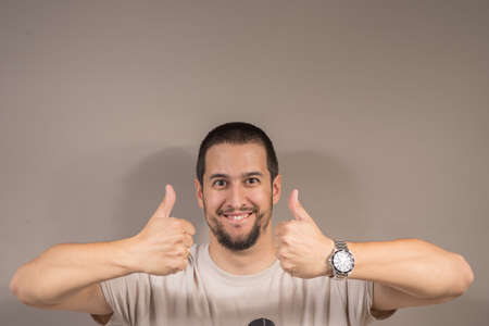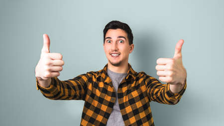 handsome young man in yellow shirt showing with both hands thumbs up like gesture on grey color background