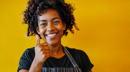 Happy African American Woman Giving Thumbs Up, Positive Feedback and Approval Concept on Yellow Background