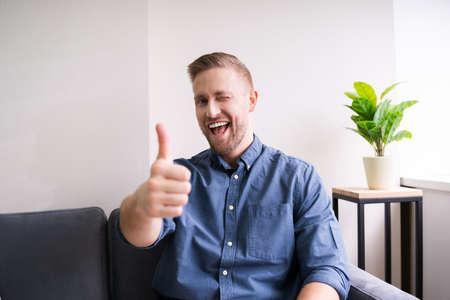 Portrait Of A Happy Young Man Showing Thumbs Up And Winking At Home