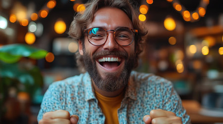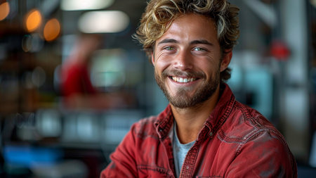 A young man with long hair and a beard sits in a coffee shop smiling honestly while surrounded by warm lighting and coffee-making equipment. His plaid shirt adds to the relaxed vibe.