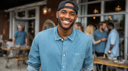 Smiling young man wearing denim shirt and cap stands confidently outdoors. background features lively gathering of people, creating cheerful atmosphere