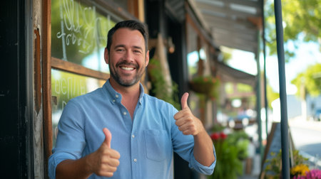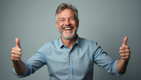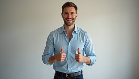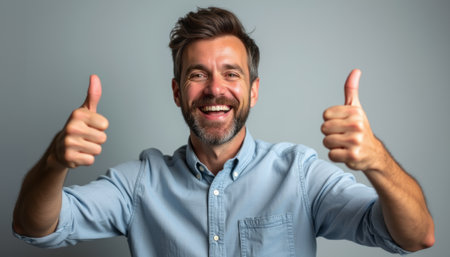 A confident man with a bright smile stands against a neutral background, enthusiastically giving two thumbs up. His positive energy radiates, making this image perfect for conveying success, encouragement, and a can-do attitude.