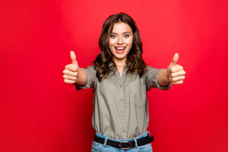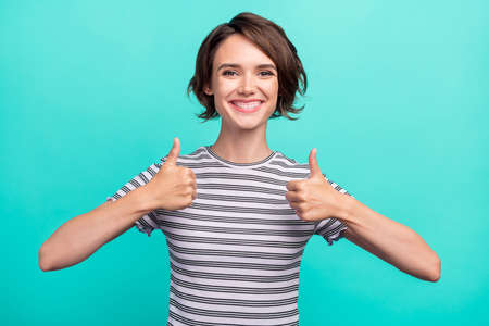 Close up photo beautiful funny funky her she lady show thumb up good quality tested short straight hairdo kind brown eyes wear casual pastel t-shirt clothes isolated teal turquoise green background