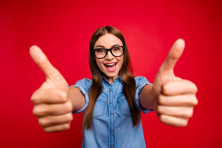 Photo of young girl happy positive smile show thumb-up fine great feedback isolated over teal color background