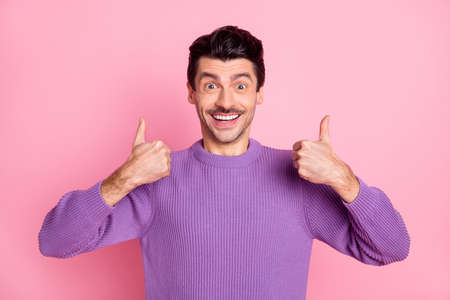 Photo of funny attractive young man dressed purple pullover showing two hands arms thumbs up isolated pink color background