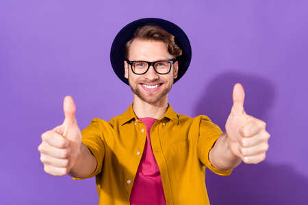 Photo of attractive happy cheerful young man show thumbs up advice advert isolated on violet color background