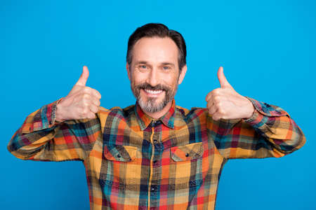 Photo of crazy excited guy shiny smile raise two thumbs up wear plaid shirt bow tie isolated blue color background