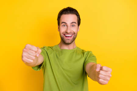Photo of impressed beard millennial guy drive wear green t-shirt isolated on yellow color background