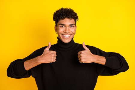 Photo of optimistic brunet guy show ok sign wear black sweater isolated on yellow color background