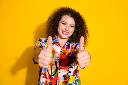 Photo portrait of pretty young girl thumb up approve wear trendy colorful print outfit isolated on yellow color background