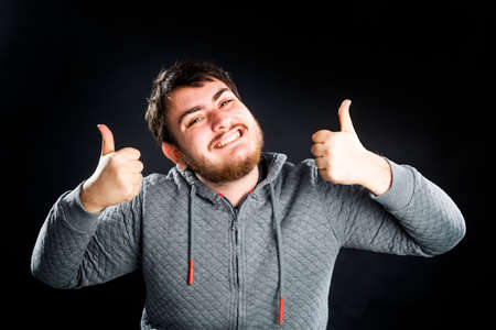 Portrait of happy smiling handsome man guy giving thumb up gesture in studio on black. Success.