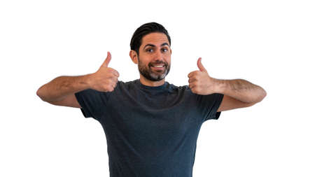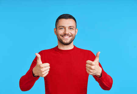 Caucasian man showing thumb up and standing on white background. Portrait of a person looking at camera. Handsome male model.