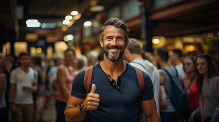 A joyful man with a full beard and a warm smile enthusiastically gives double thumbs up against a neutral background. His casual attire and backpack suggest a sense of adventure and readiness, radiating positivity and confidence.
