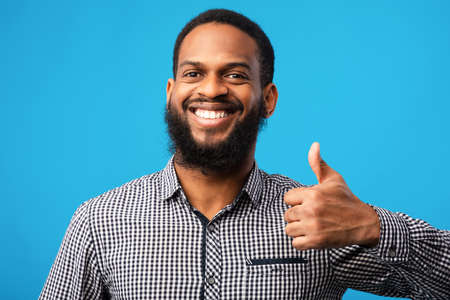 Headshot Of Smiling Afro Guy Gesturing Thumb Up At Camera While Posing Over Blue Background In Studio