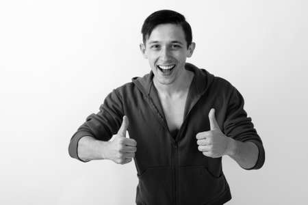 Studio shot of happy young handsome man smiling while giving thumbs up against white background