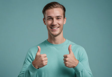 A cheerful man in a light teal sweater giving two thumbs up with a bright and friendly smile.