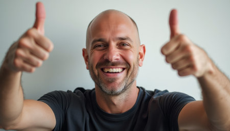 A joyful man with a shaved head and a broad smile enthusiastically shows double thumbs up against a light background. His expression radiates positivity and confidence, making it a perfect image for conveying success and happiness.