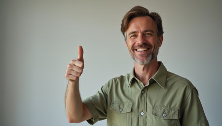 A smiling man with a well-groomed beard and stylish hair is giving a thumbs-up against a soft, neutral background. His expression radiates positivity and confidence, making this image perfect for conveying encouragement and success.