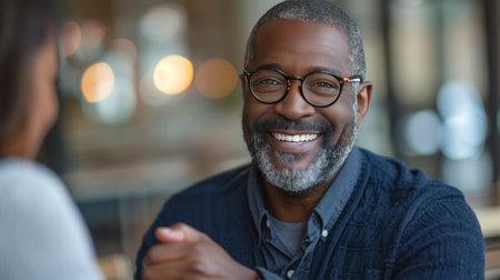 A middle-aged businessman smiles as he shakes hands with his partner.