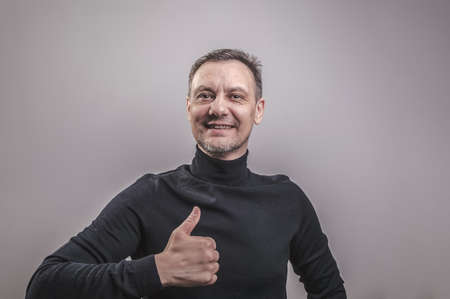 Cheerful smiling man in stylish blouse looking approvingly at camera, nods his head, showing thumbs up on black background. Facial expression of bearded positive guy with gray hair. Modern fashion