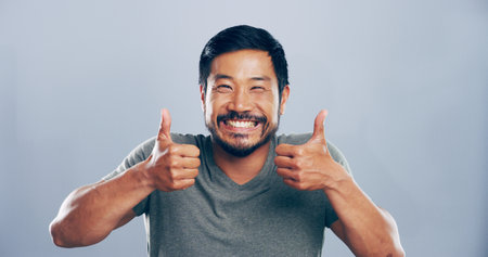 Happy, asian man and portrait with thumbs up for success or approval on a gray studio background. Face, male person or model with smile, like emoji or yes sign for winning or agree on mockup space