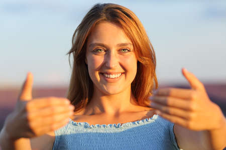 Stylish young pretty girl attractive caucasian redhead teen woman girlfriend cheerful smiling friendly looks at camera puts thumb up gesture recommends best choice shows everything fine stands outside