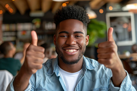 Portrait of a smiling man showing thumbs up in a coffee shop