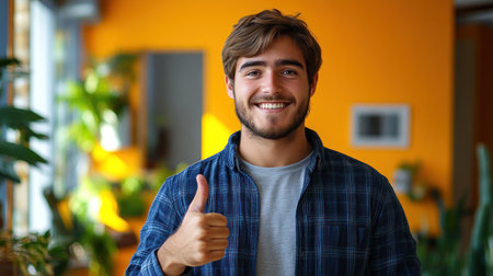 Smiling young man gestures thumbs up while standing in a lively indoor space surrounded by plants.