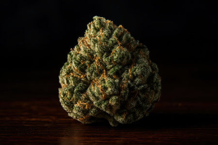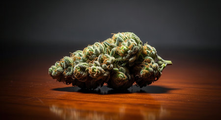 Perfectly formed cannabis bud with visible trichomes and orange hairs, resting on a dark polished wooden surface. focus on detail, legal cannabis, medical marijuana.