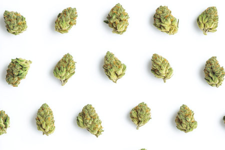 Fresh marijuana buds close-up. Cannabis flowers on white background. Macro, top view. Weed stuff, legal CBD recreational use.